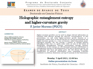 El departamento de física PUCV tiene el agrado de invitarles al Examen de Avance de tesis para la obtención del grado académico de Doctorado en Ciencias Físicas: Título: Holographic entanglement entropy and higher-curvature gravity Tesista: F. Javier Moreno (PUCV) Fecha: Lunes 5 de abril 2021, a las 12:00 hrs Personas Interesadas por favor regístrarse con Lorena Aguirre (dirfis@pucv.cl), para […]