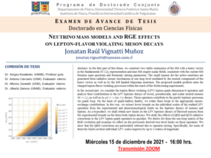 Están cordialmente invitados en participar el Examen de Avance de Tesis, Doctorado en Ciencias Físicas, correspondiente al Sr. Jonatan Vignatti Muñoz, el cual se realizará vía zoom el miércoles 15 de diciembre 2021 a las 16​:00 hrs.   Link de conexión: