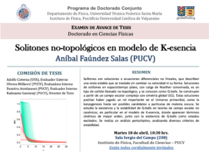 Estimados(as) profesores(as) y estudiantes, Es un placer para mí, Nelson Videla, Director principal del programa de Doctorado en Ciencias Físicas en conjunto con la Universidad Técnica Federico Santa María, invitarles a todos(as) al Examen de Avance de Tesis del Programa de Doctorado en Ciencias Físicas. La presentación del avance de tesis lleva el título "Solitones […]